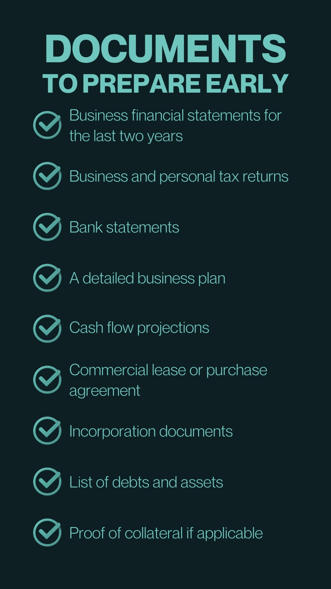 • Start preparing early: Begin gathering documents, reviewing your finances, and researching lenders at least two to three months before you need funding. Early preparation helps you avoid last-minute surprises.